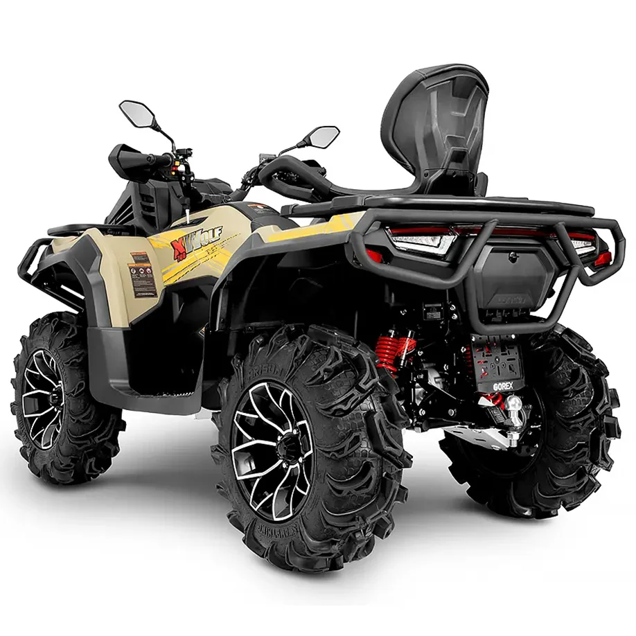 Versiunea 700L Mud duce conceptul XWolf la următorul nivel: vine din fabrică deja „pregătit de luptă”. Roți mari, agresive, de 27”, pe jante de 14”, suspensie revizuită cu reglaje complete, protecții extinse, bare față-spate, radiator mutat sus pentru respirabilitate în bălți adânci și snorkel-uri pentru admisia motorului și a variatorului. Totul proiectat, testat și asamblat la Loncin, cu compatibilitate garantată – nu improvizații.
